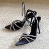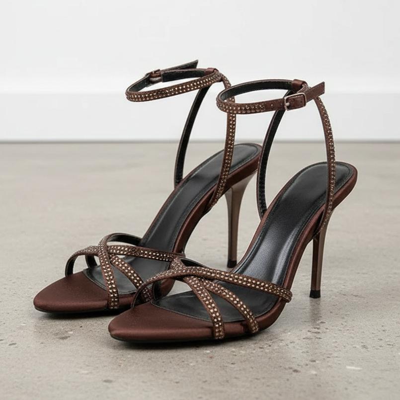Women's Crystal High Heel Sandals Summer Sexy Pointed Toe Stilettos Brown Satin Rhinestone Ankle Strap Party Wedding Shoes