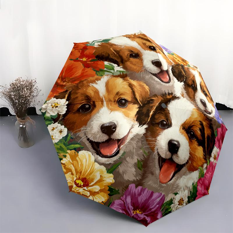 0106 Dog In Flower Bush Pattern, Automatic Folding Umbrella, Portable and Foldable Design, 8 Ribs, a Christmas or Birthday Gift.