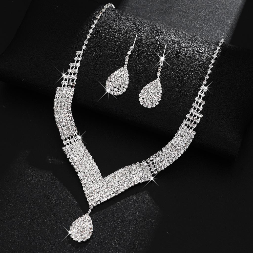 2Pcs Fashionable Rhinestones Necklaces Earrings Jewelry Set Women'S Wedding Accessories Gift