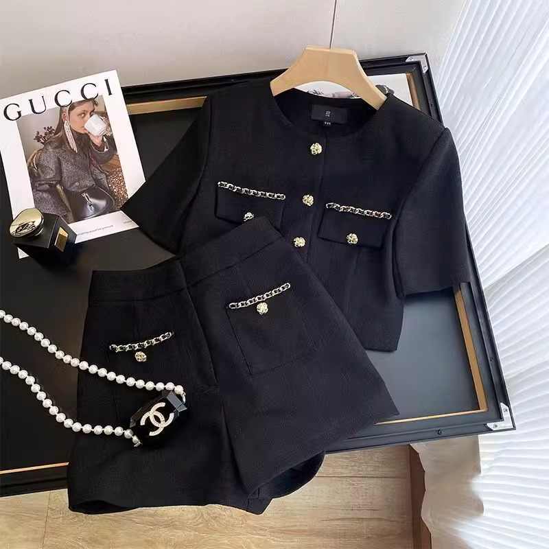 Fashion Office Lady Outfit Summer Chain Splicing Tweed Suit Women Single Breasted Top+Slim Shorts Elegant 2Pcs Set