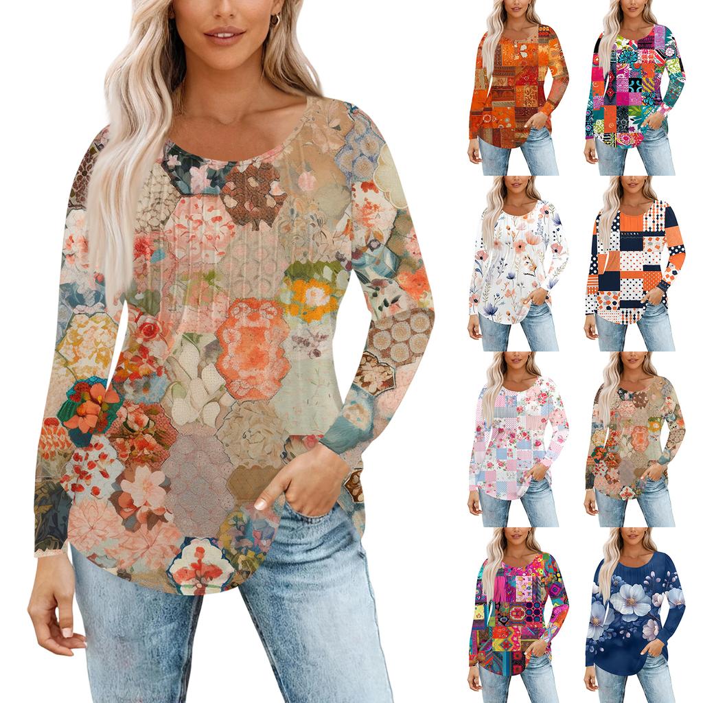 Women's Fashion Casual Pleated Round Neck Vintage Floral Print Long Sleeve T-Shirt Top