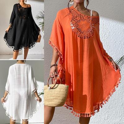 European & American Beach Cover-Up: Hand-Crocheted Solid Color Patchwork Loose Dress with Tassels, Sun Protection, Short and Sexy Style