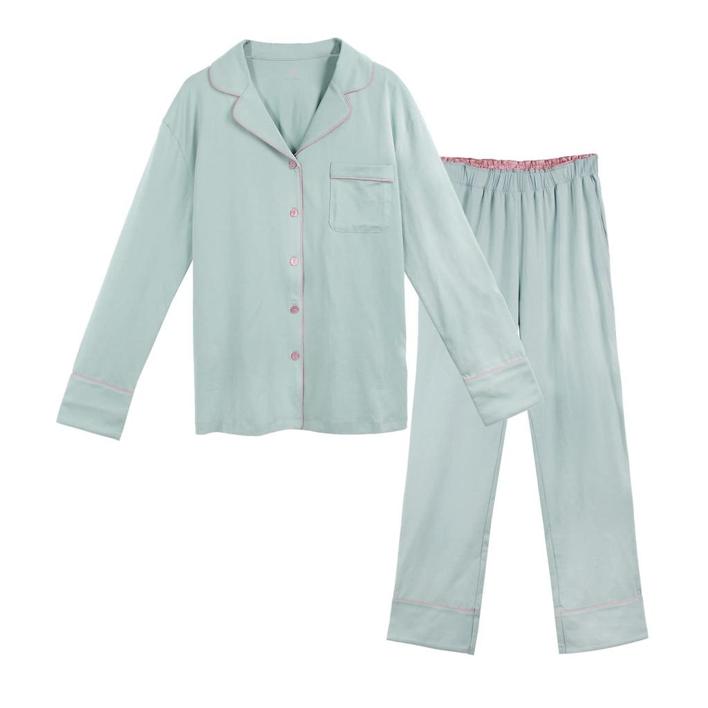 Rose Halcyon Pajama Breathable Long Solid Cute for and Winter Size Loungewear, Two-Piece Set, Open-Front, Comfortable, Cotton, Sleeves, Pants, Green,