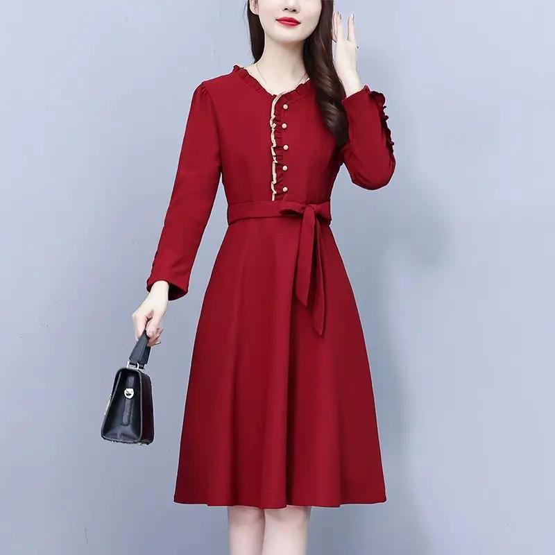 Women's Burgundy Long Sleeve Dress Button Detail Belted A-line Formal Casual Gown