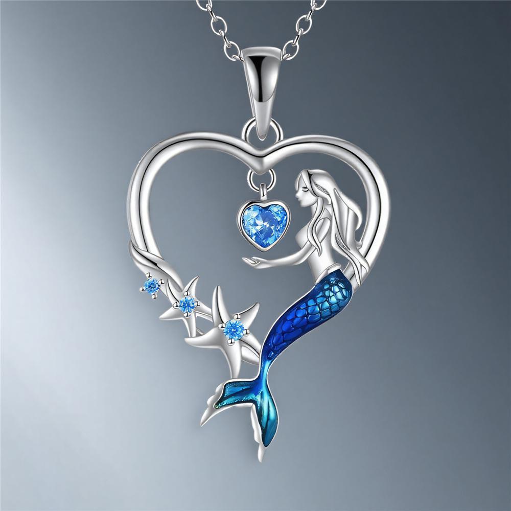 Luxury Female Crystal Blue Zircon Stone Heart Mermaid Pendant Necklace Vintage Silver Color Wedding For Women