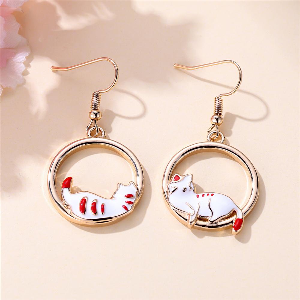 Unique Female White Cat Round Metal Drop Dangle Earrings Cute Gold Color Party For Women