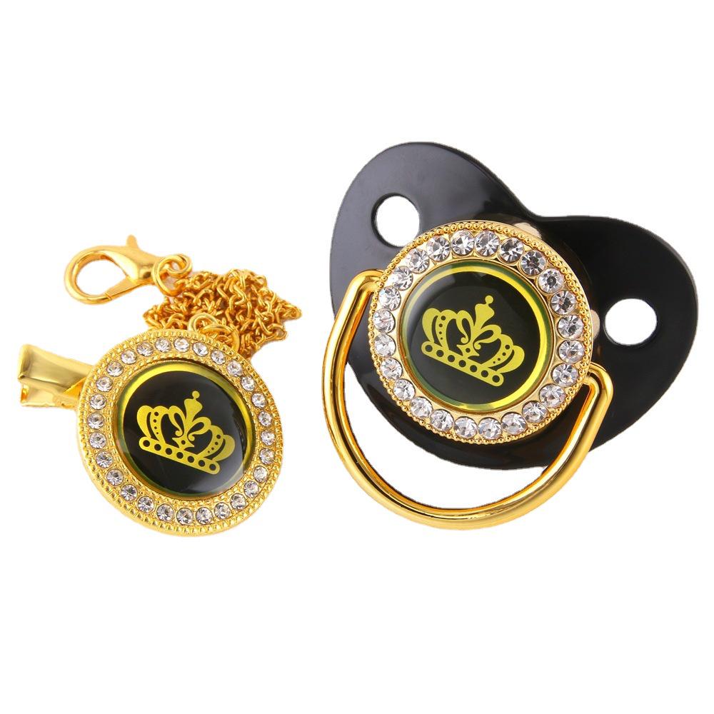 High-End Gold Diamond Baby Pacifier with Cartoon Crown and Chain Clip