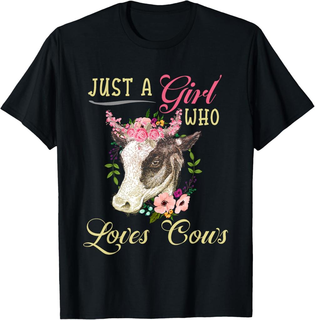 Just a Girl Who Loves Cows Graphic Tee Cute Floral Cow Head Women Casual T-Shirt
