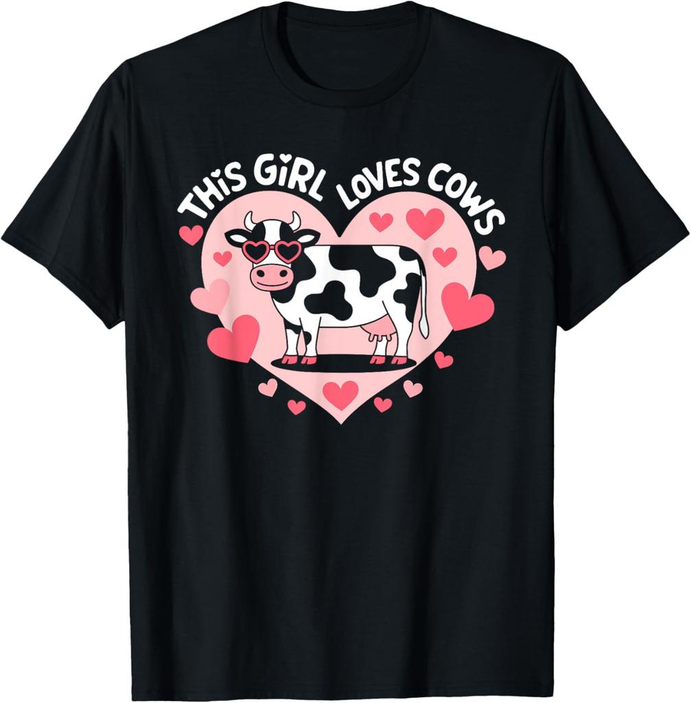 Cute Cartoon Cow Heart Graphic Tee This Girl Loves Cows Farm Animal T-Shirt Unisex Print Machine Washable