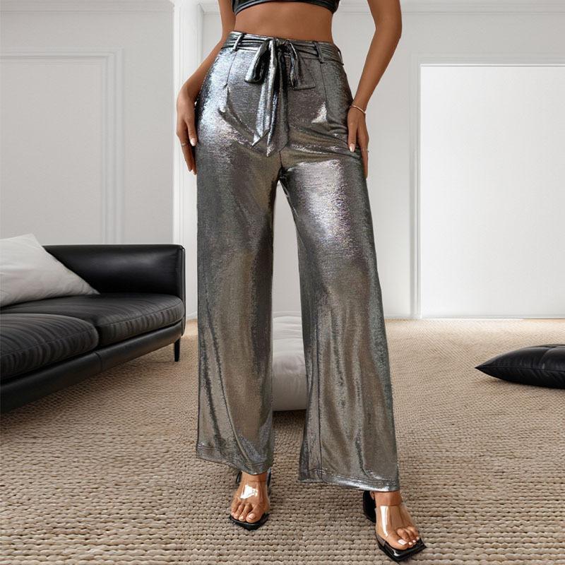 Women's Silver Shiny High-waist Wide-leg Pants with Bow Detail Party Casual Trousers