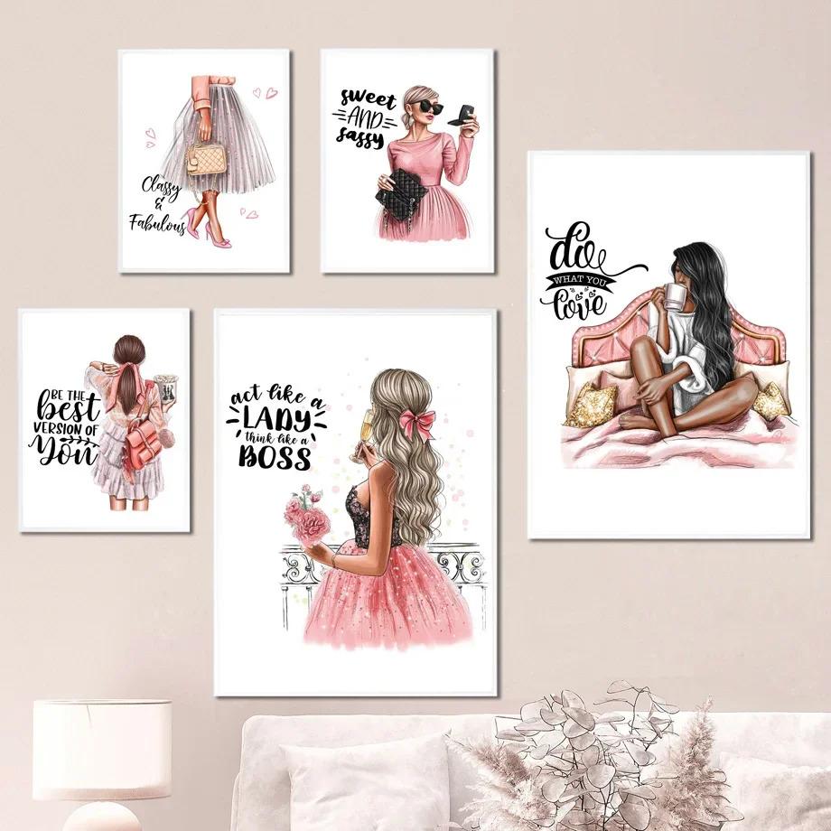 Flowers Black Girl Coffee Goblet Illustration Fashion Art Canvas Painting Nordic Posters Prints Wall Pictures Living Room Decor