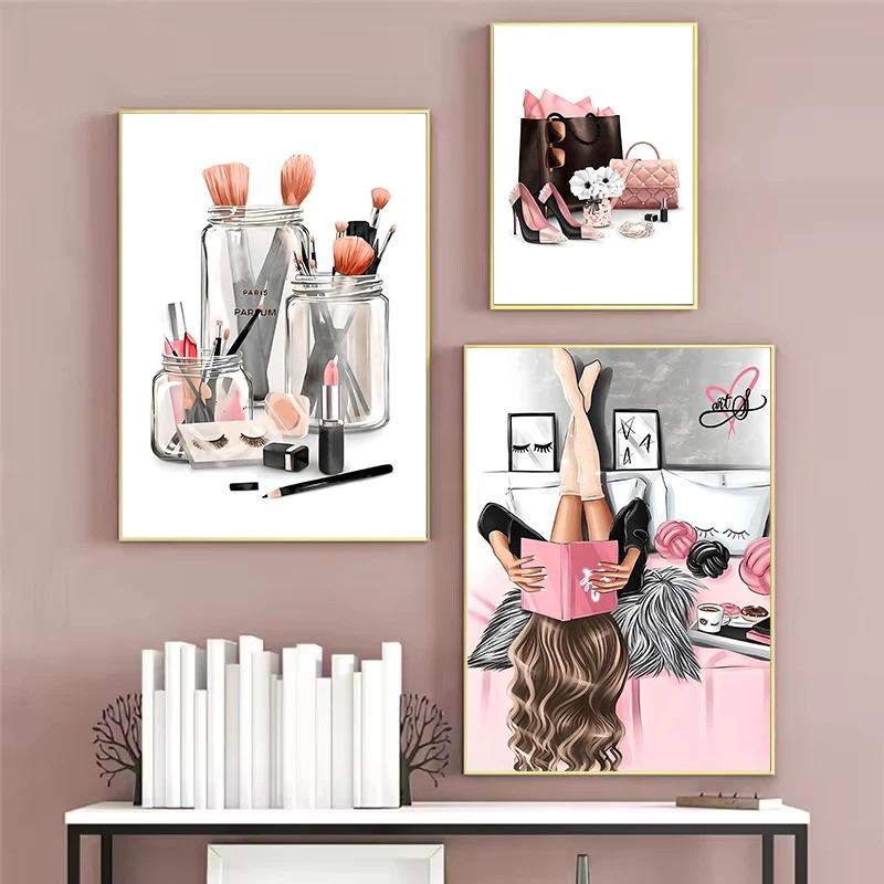 Fashion Girly Pink Makeup Collection EyeLash Lipstick Perfume Poster Canvas Painting Wall Art Pictures Home Bedroom Decor