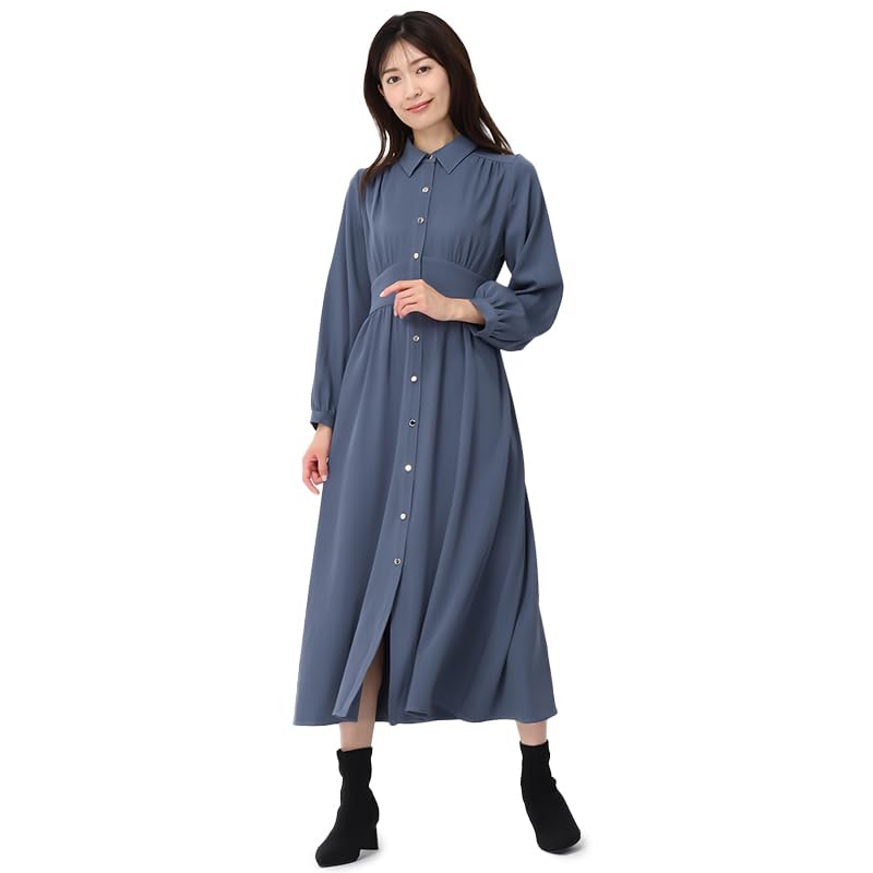 Mishmash MM447415 BLUE Shirt Dress with Front Waist Puff Long Simple Design Women's Buttons, Opening, Belt, Sleeves, Length, Basic,