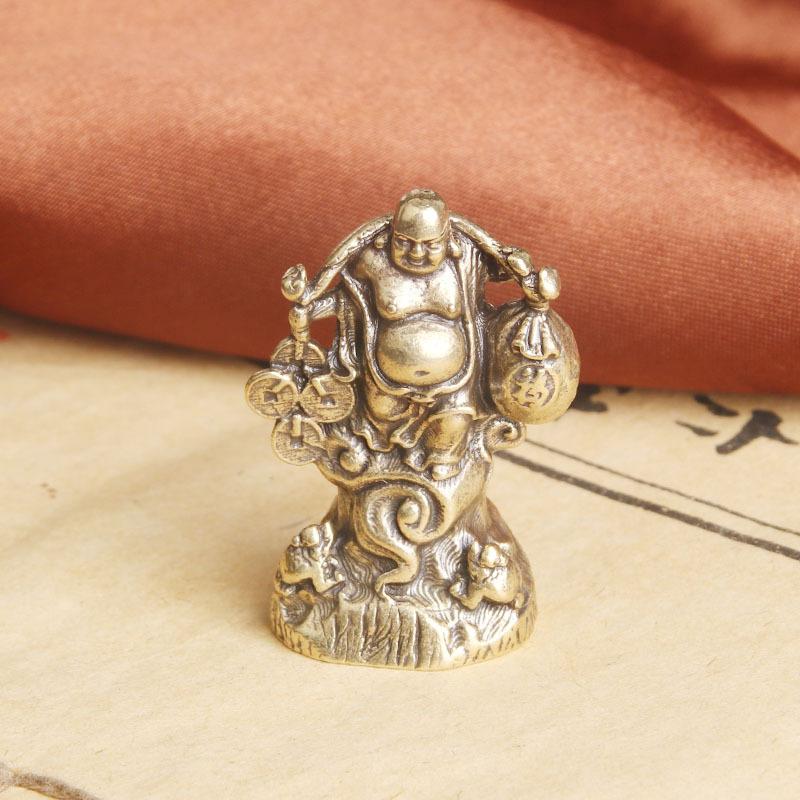 Vintage Pure Brass Wealth Arhat Desktop Ornament Maitreya Buddha Holding Gold Coins Lucky Bag Creative Decoration Old Copperware