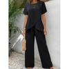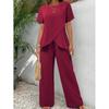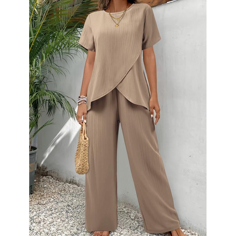 This chic women's casual set features a unique short-sleeve top paired with wide-leg pants in a versatile khaki shade.
