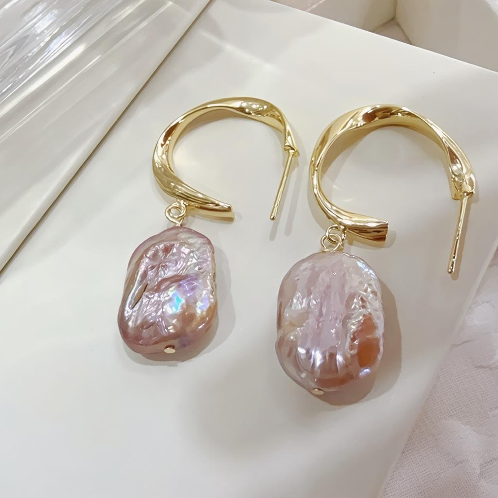 Big C Natural Light Pink Purple Baroque Pearl Earrings, Earrings, French Special-shaped Beads, Large Square Stud Earrings, Simple Earrings.