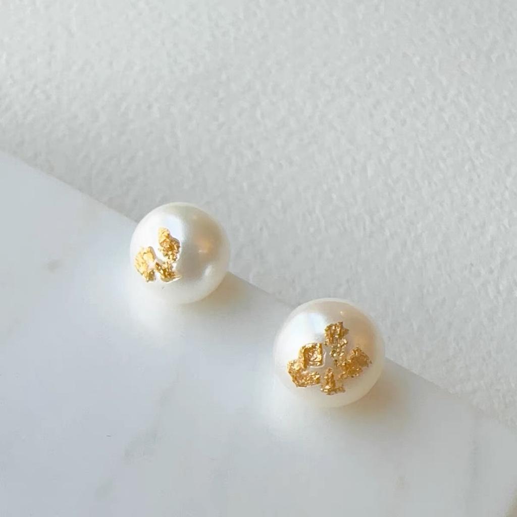Fashion Trendy Gold Foil Film Natural Freshwater Pearl Earrings Gentle Plain Silver S925 Silver Stud Earrings Versatile Casual