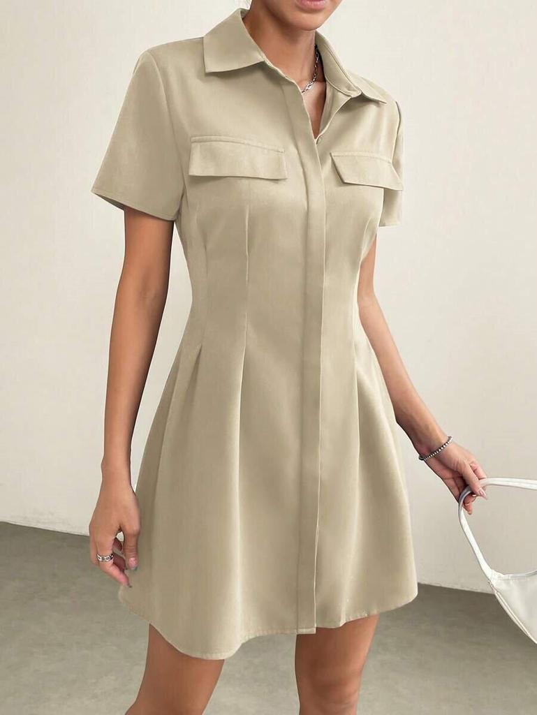 This stylish mid-length shirt dress features a classic turn-down collar and a flattering pleated waist design, perfect for adding a touch of sophistication to your wardrobe. Made from high-quality polyester, it offers a soft and comfortable fit while maintaining its shape throughout the day. Ideal for both European and American fashion aesthetics, this dress effortlessly combines elegance and versatility, making it suitable for various occasions, from casual outings to more formal events.