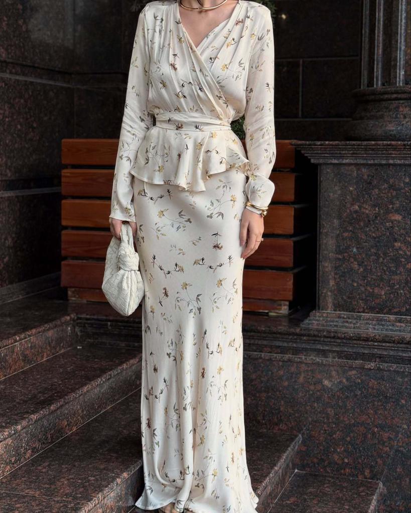 2025 Summer Floral Long-sleeve Tie-up Jacket and Midi Skirt Women's Fashion Set