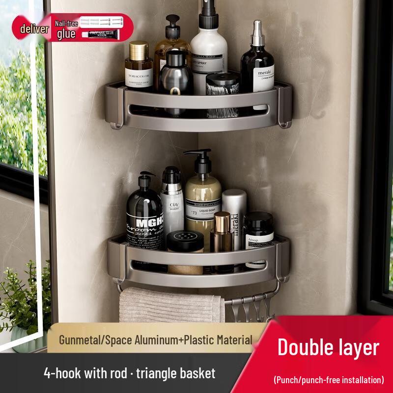 Punch-Free Gunmetal Grey Stainless Steel Double-Layer Bathroom Corner Shelf with Towel Bar