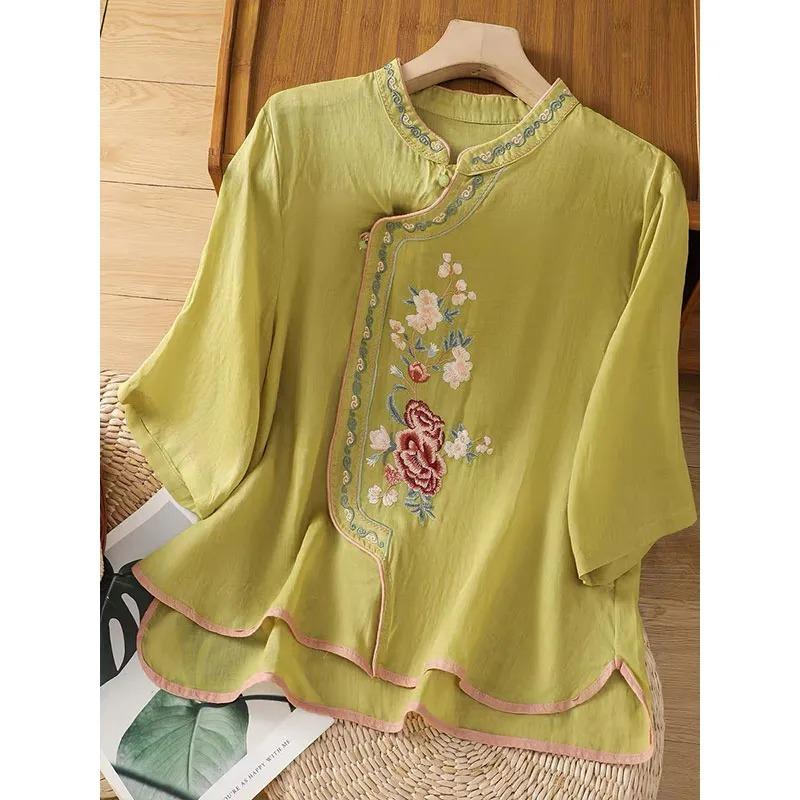 Women's Beige Cheongsam Style Blouse Embroidery Detail Half-Sleeve Casual Top