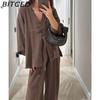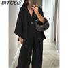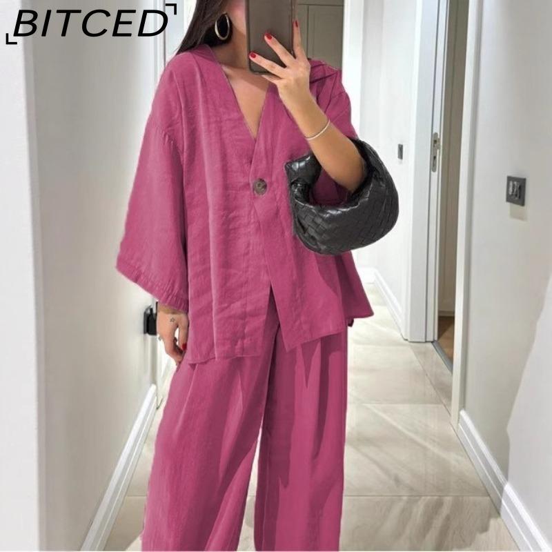 BITCED Women's Fashion Casual Set V-neck Single-Button Loose-Fit Long-Sleeve Top High-Waisted Trousers Two-Piece Set
