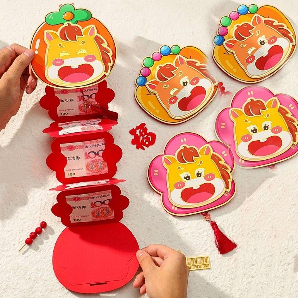 Cartoon Folding Red Envelopes 5 Card Slot 2026 Horse Year Lucky Red Packets Traditional with Tassels Cash Envelopes
