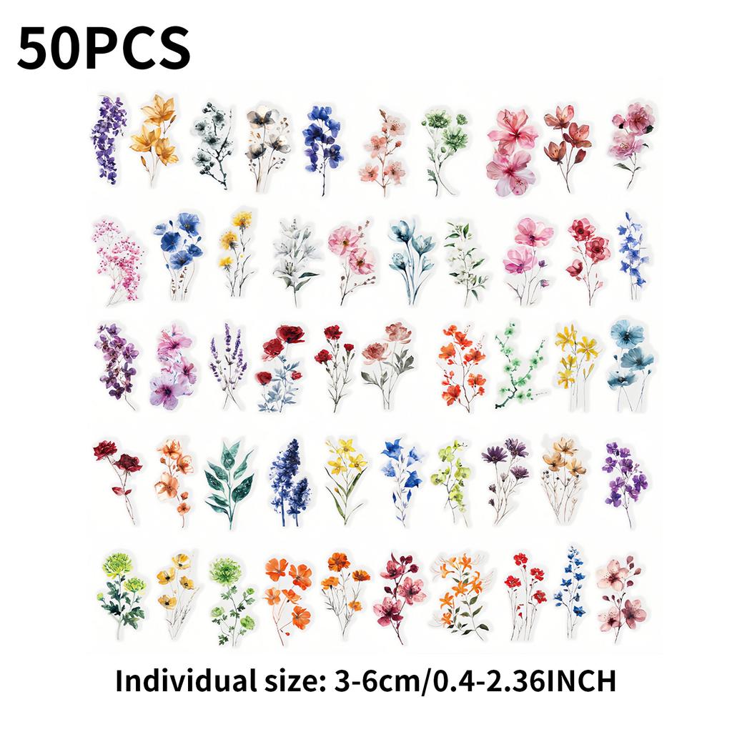50-Piece Watercolor Floral Sticker Pack for Instagram Waterproof Transparent PET Material Flower Decorations for Handmade Notebo