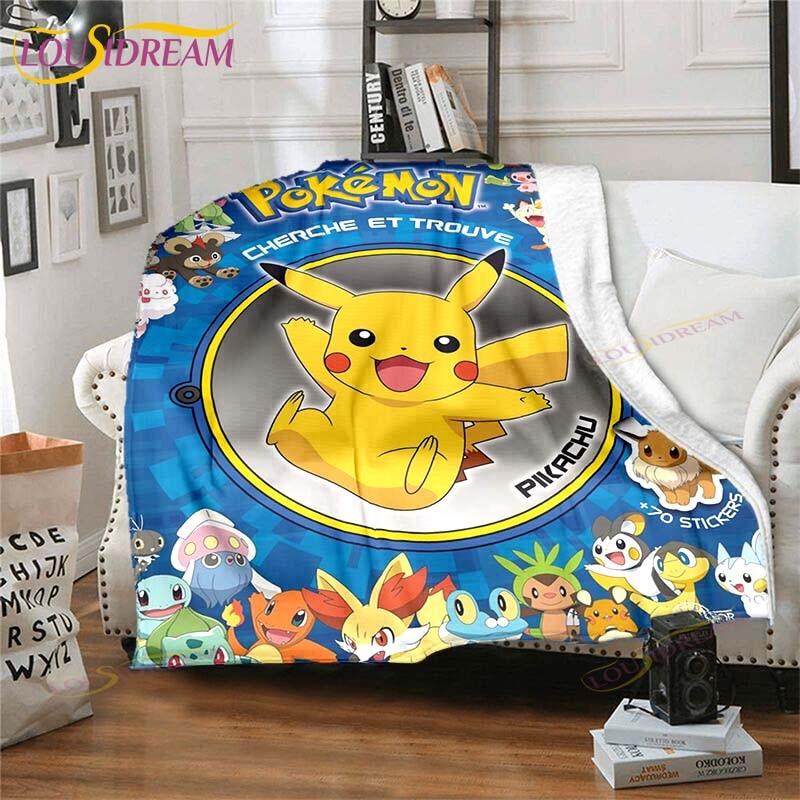 Cartoon Pokemon Printed Pikachu Fleece Plush Blanket Soft Warm Blanket for Adults and Children Bedroom Sofa Gift Picnic Blanket