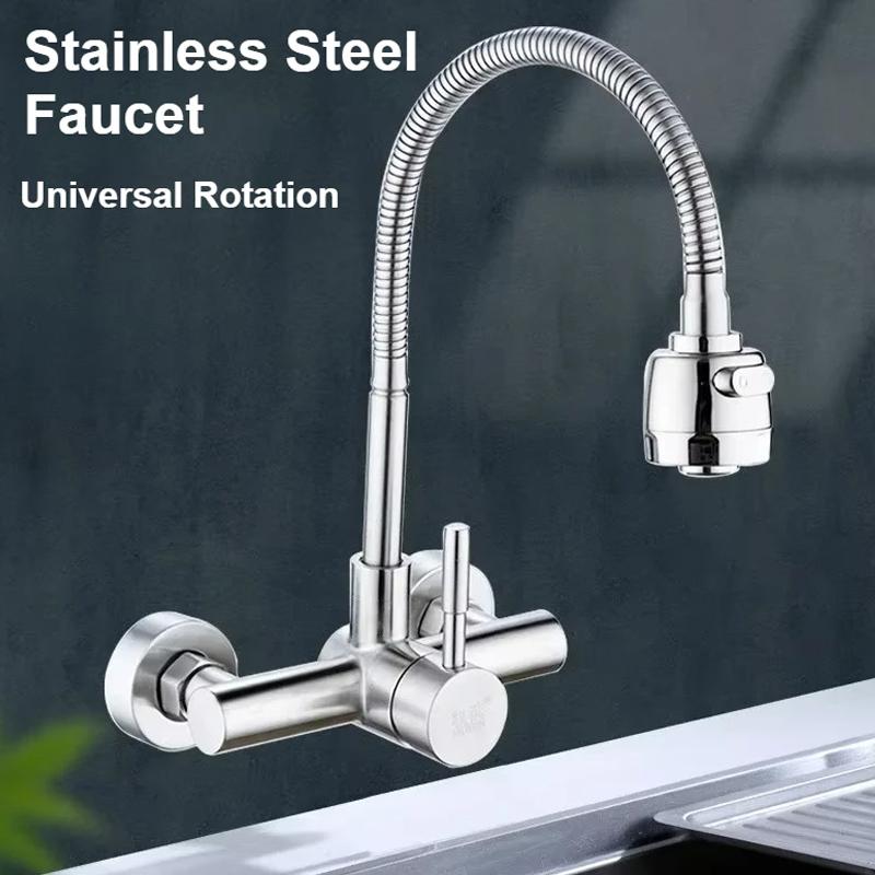 Universal Wall Mounted Stainless Steel Kitchen Faucet Cold and Hot Tap 360 Degree Swivel Flexible Hose Single Handle Faucet