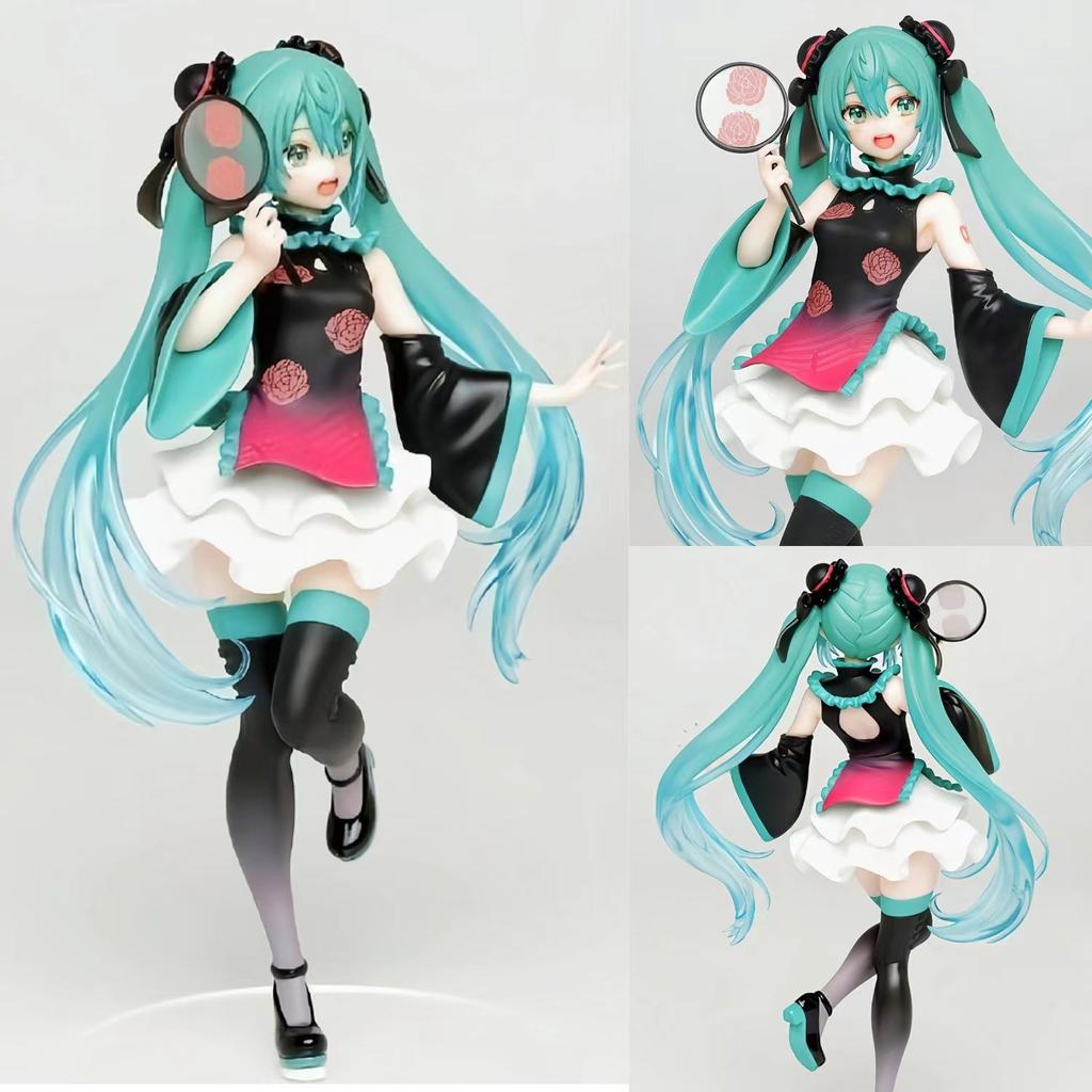Hatsune Miku Anime Girl Figures Chinese Style Cheongsam Standing Posture with a Fan In Hand Figurines Doll Model Kids Toys Gifts