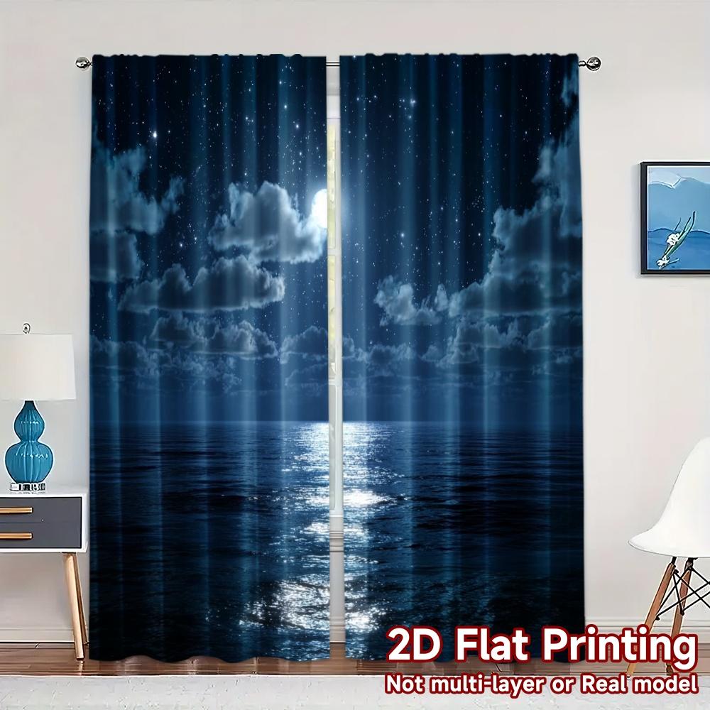 2pcs 2D FLAT PRINTING Curtains (Without Rod) Moonlit Ocean Modern Light Filtering Curtains Durable Polyester Curtains