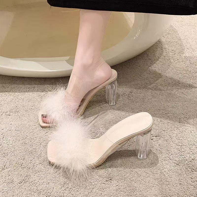 Korean Version of Thick Heel Fluffy Decorative Women Cool Slippers Summer Internet Celebrity Word Slippers Lazy High Heels