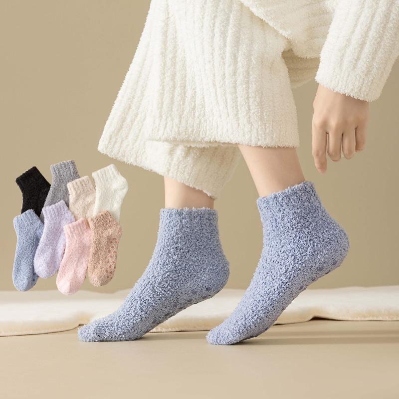 Winter Padded and Thickly Insulated Warm Ladies' Socks with Glue-attached Anti-slip Floor Sole, Simple Solid-color Coral-fiber Mid-calf Socks