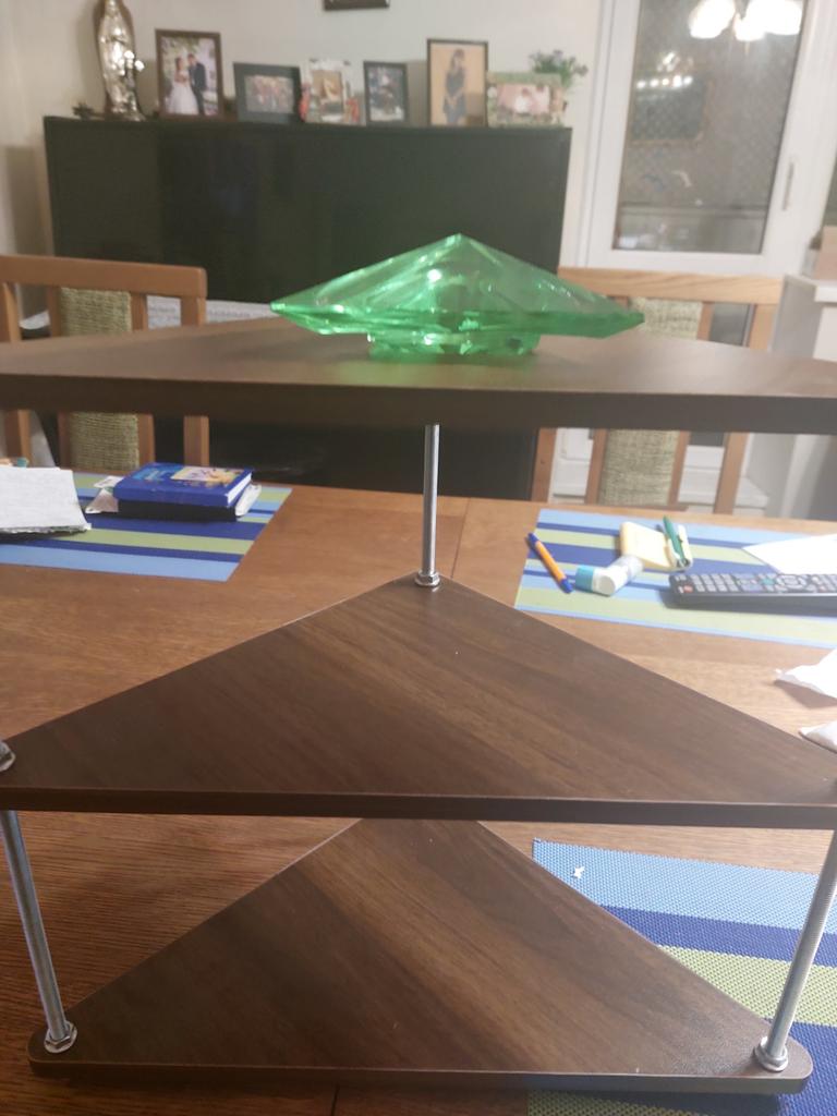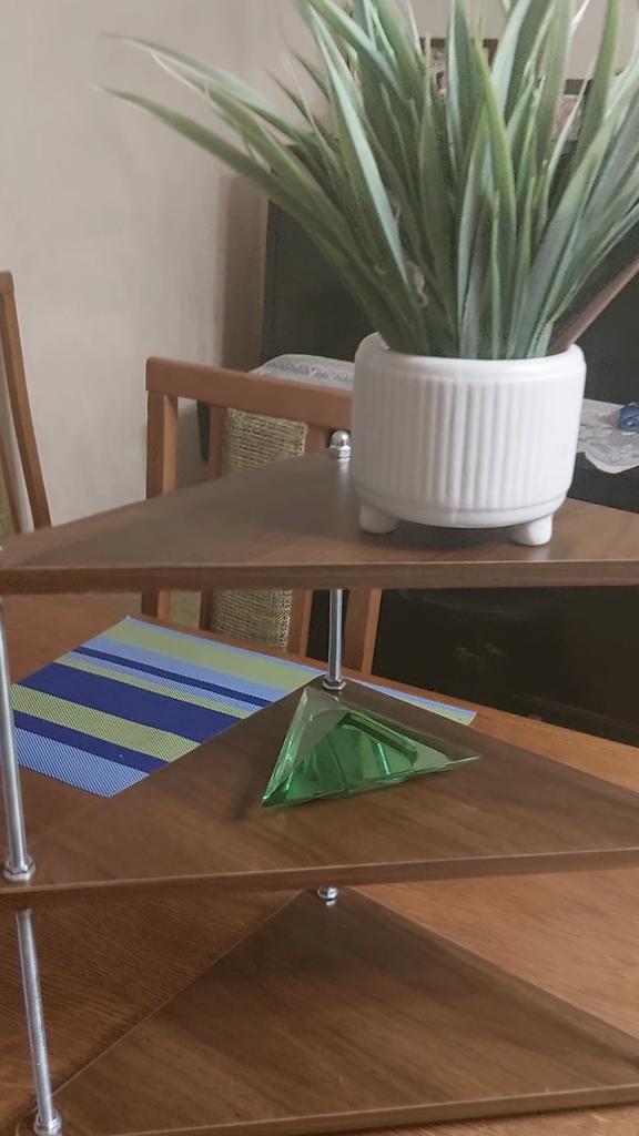 1️⃣Solid wood triangular tiers with metal posts create a stable 3-tier corner mug rack that maximises vertical countertop space.