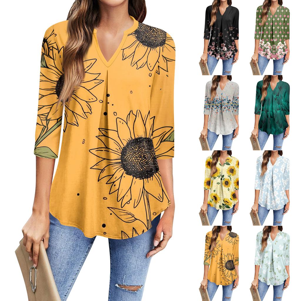 Women's Fashion Casual Three-Quarter Sleeve T-Shirt Printed V-Neck Top