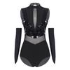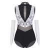 Women Shiny Sequin Leotard Gymnastics Dance Performance Outfit Mock Neck Sleeveless Sheer Mesh Waist Cutout Back Bodysuit
