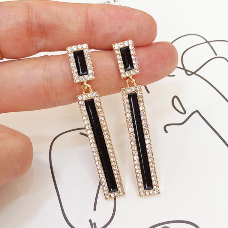 Fashion Black Color Enamel Rectangle Drop Earrings for Women Geometric Inlay Rhinestone Long Ear Wedding Party Jewelry