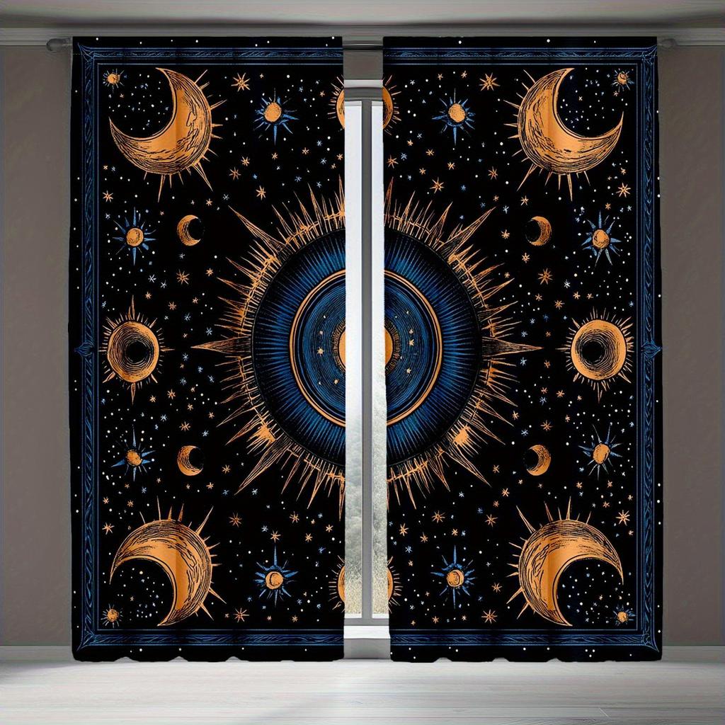 2pcs Bohemian Sun Moon Curtains - Glittering Stars & Galaxy Design Black Polyester Light Blocking Drapes with Blue & Golden Acc