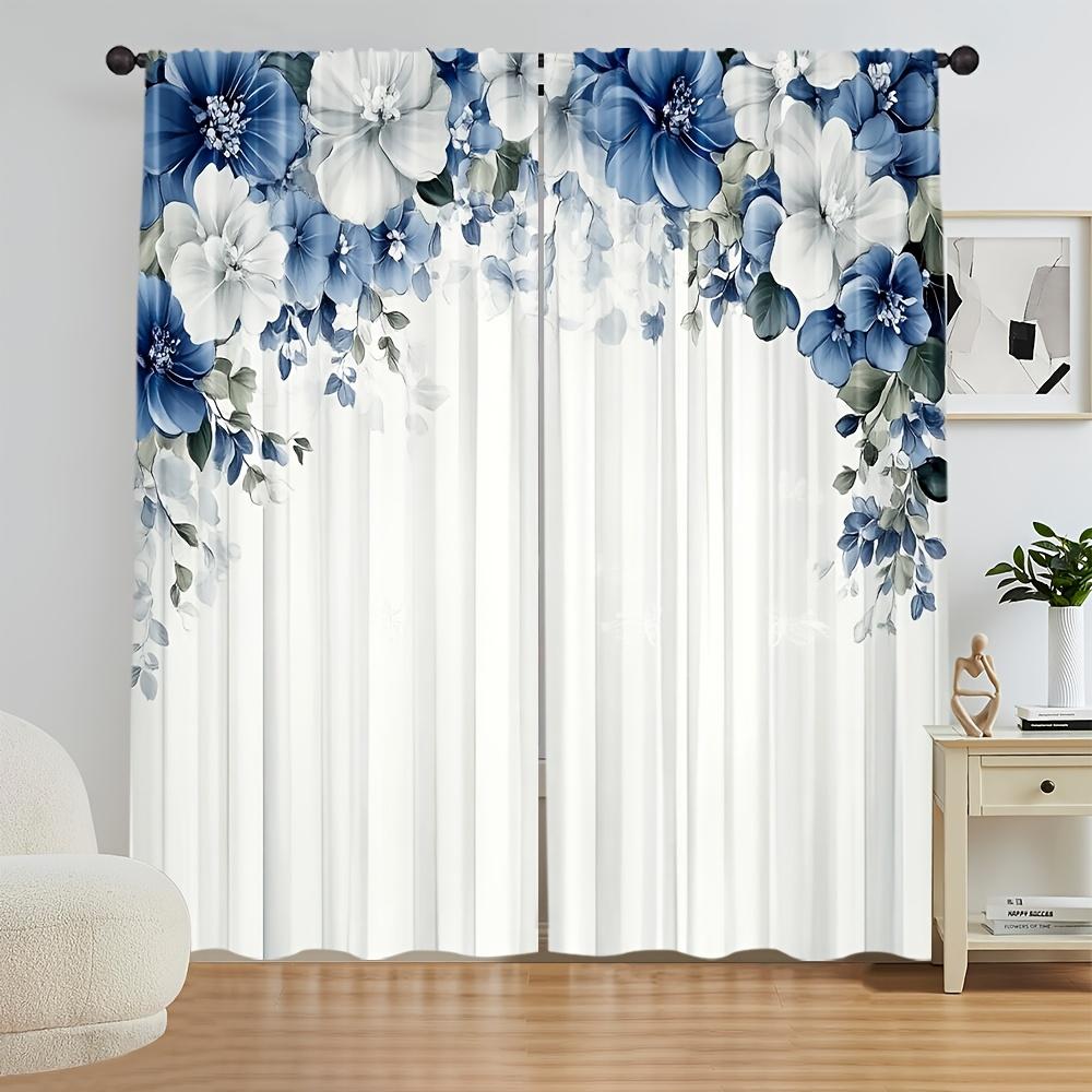 2 Pcs Elegant Blue & White Floral Curtains – Rod Pocket Design for Bedroom Living Room Kitchen Study All-Season Home Decor