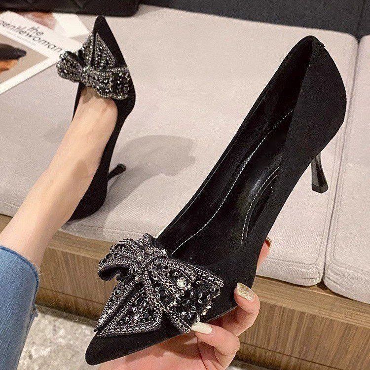 Bow Rhinestone Black High Heels Women's Thin Heels Spring and Autumn with Skirt Sexy Pointed Temperament Single Shoes