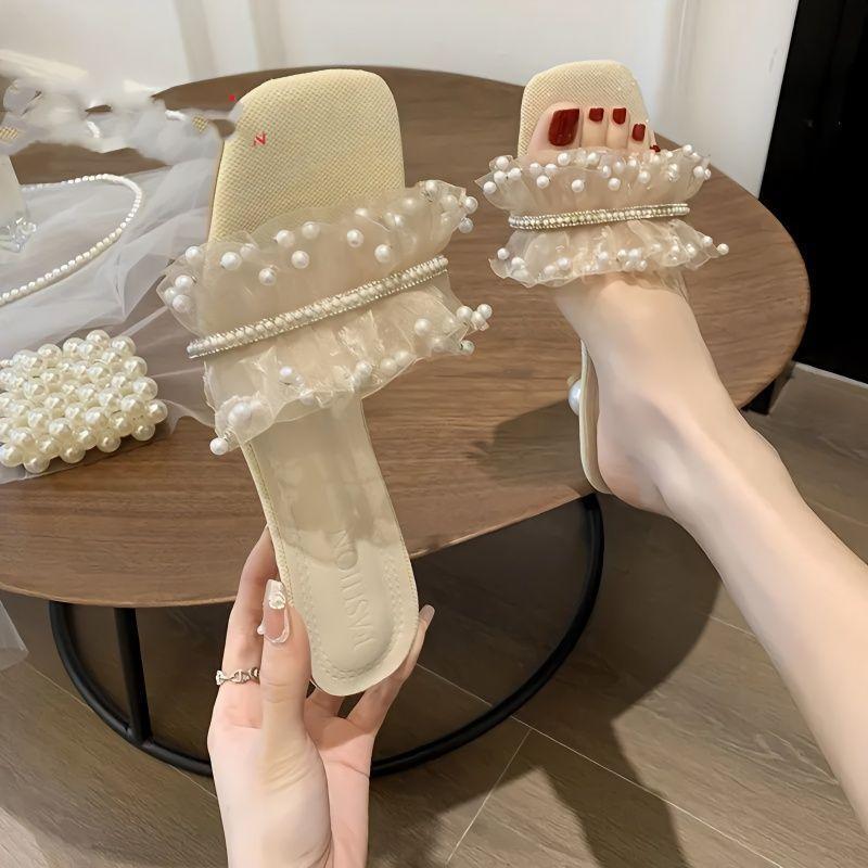 Korean Version of Fairy Style and Foreign Style with Skirt, Lace Pearl Slippers, Fashionable One-word Drag Trend for Women's New Year's Wear