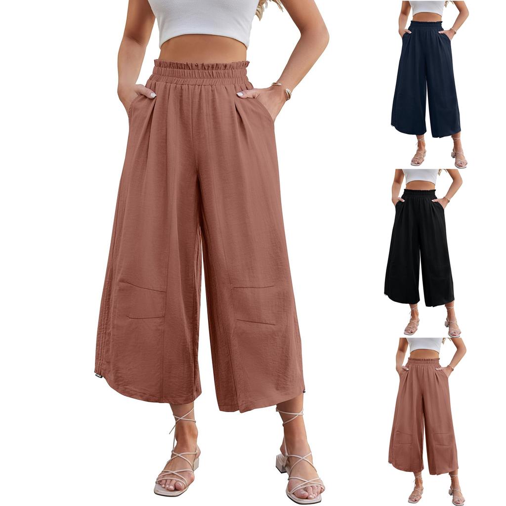 Women Elastic High Waist Pant Casual Fit Wide Leg Long Pants Trousers With Pockets