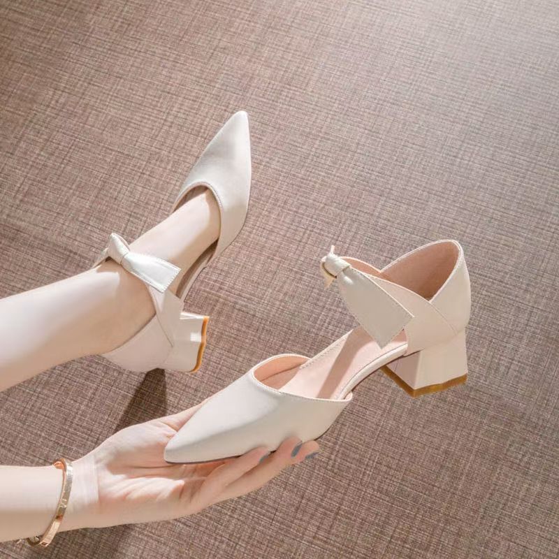 Baotou Bow 5cm Pointed Head Hollow High Heels Women's Thick Heel Spring and Summer Temperament Single Shoes Middle Heel