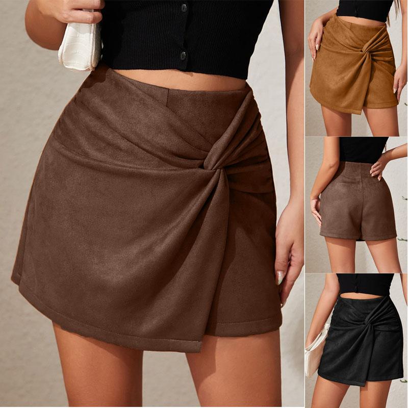 Suede Solid Color Buttocks Wrapped Skirt Pleated Irregular Zippered Short Skirt for Women's Clothing