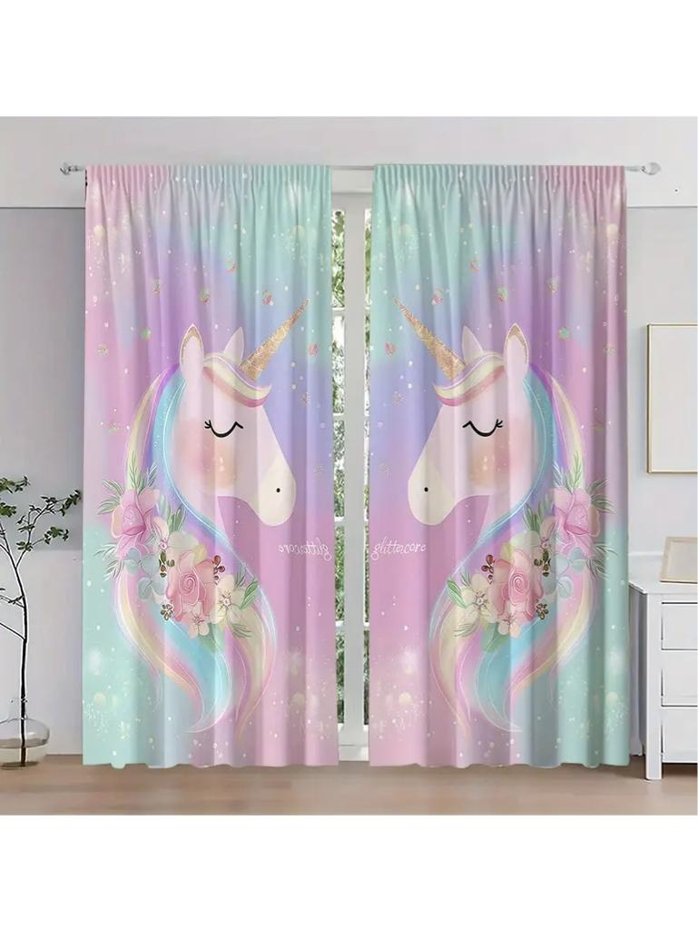 2PCS Pink Green Unicorn Curtain with Pole Bag Design Protecting Privacy Suitable for Various Decorative Scenes