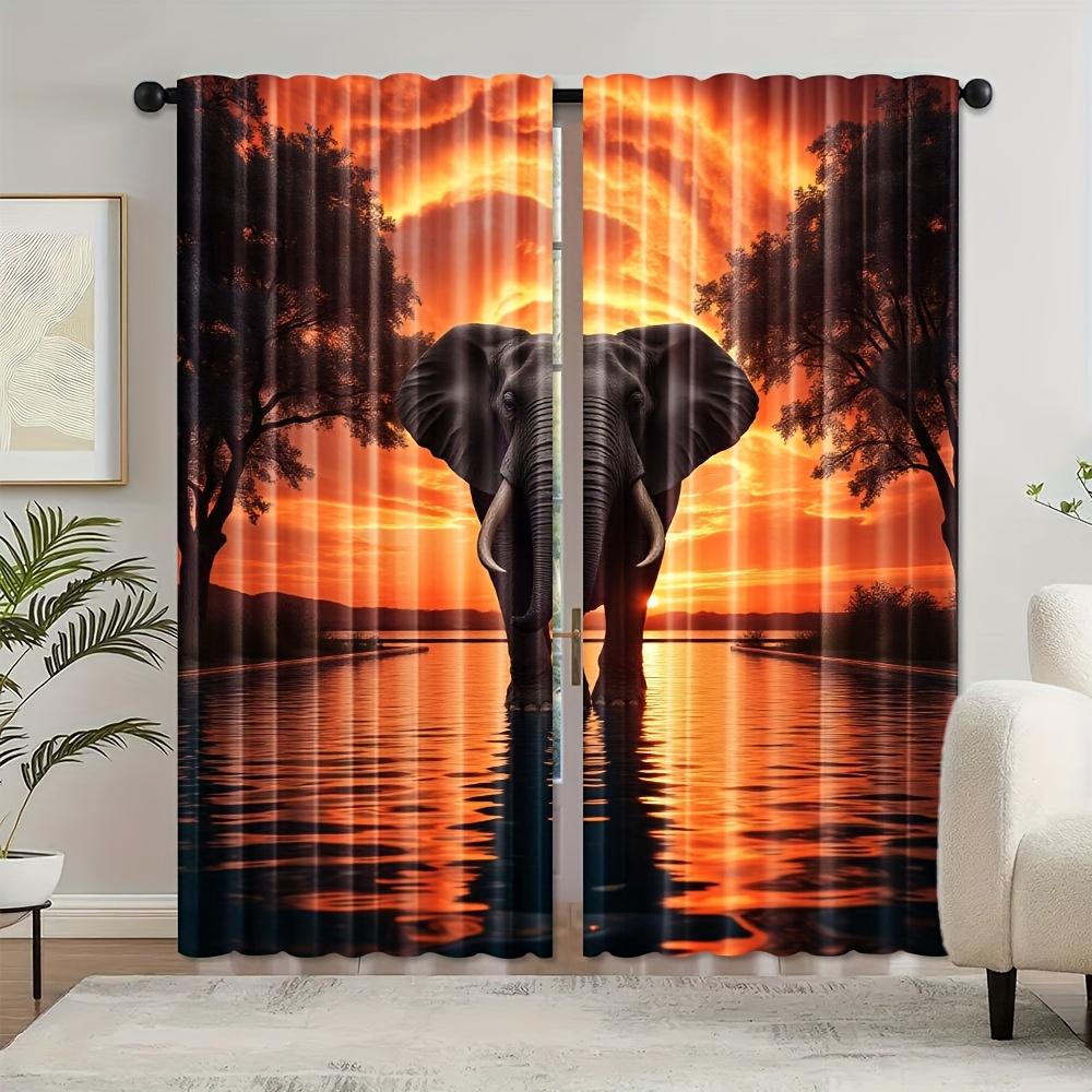 2pcs Elegant Elephant Sunset Water Reflection Artwork Pattern Curtains Light Filtering Polyester Rod Pocket Design for Bedroom