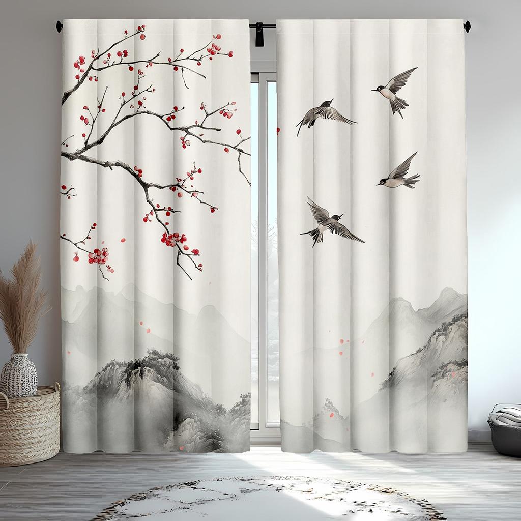 2pcs Classic Japanese Scenery Polyester Curtains Mountain and Seagull Print Drapes for Living Room and Bedroom Decor