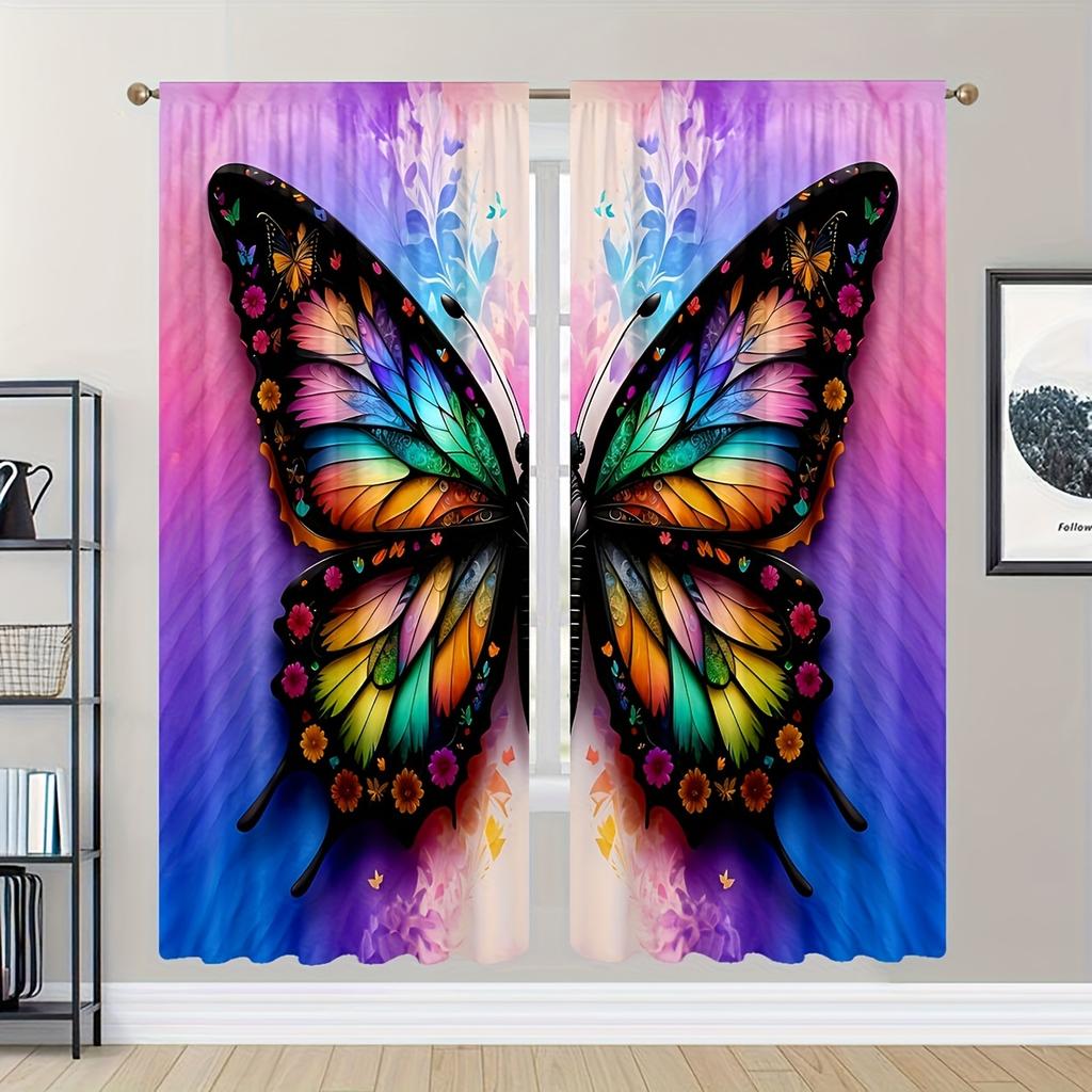 Two Pieces of Semi-Transparent Curtains with a Five-Color Butterfly Print Suitable for Study Kitchen Living Room Dormitory