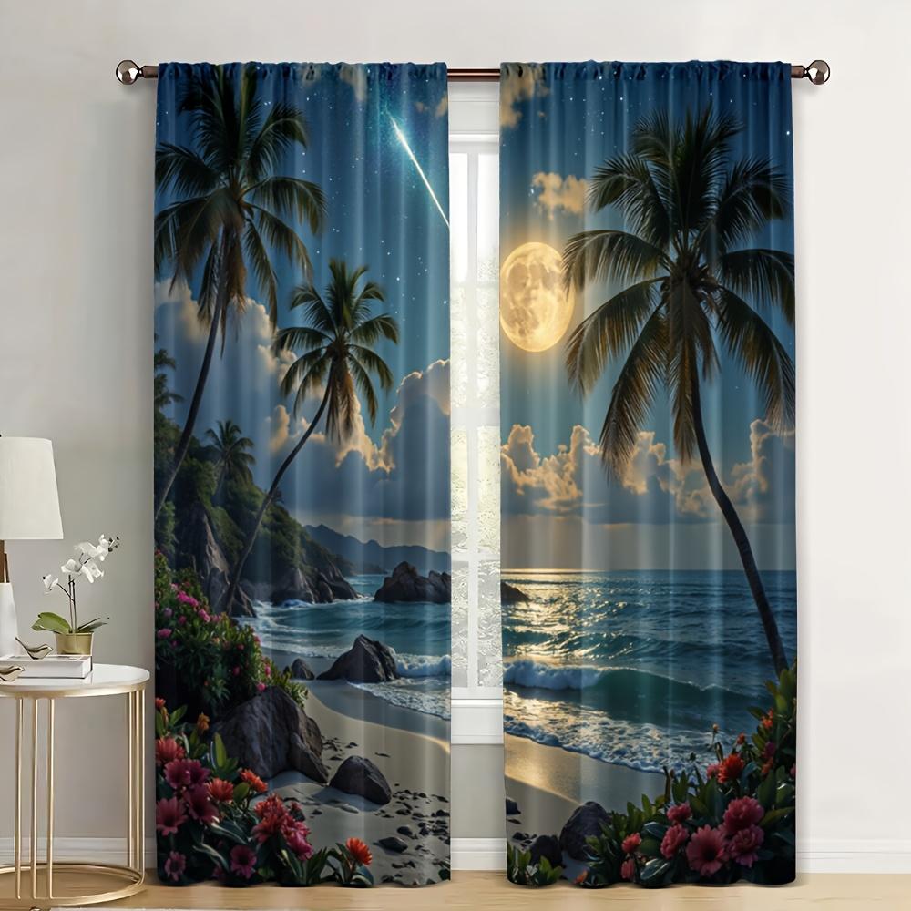 2pcs Tropical Beach Moonlit Night Scene Blackout Curtains Polyester Knit Weave Machine Washable All-Season Drapes for